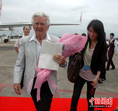博鳌亚洲论坛年会将于4月9日至11日举行,澳大利亚前总理霍克8日抵达海口美兰机场出席年会。中新社发 王辛莉 摄