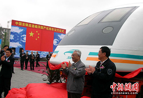 4月8日上午,中国首辆高速磁浮国产化样车在成都实现交付,预计今年7月投入磁浮上海示范线商业营运,往返于浦东国际机场站与世博园站之间,为上海世博会服务。这辆高速磁浮国产化样车由中航工业成飞制造,时速为每小时500公里。该样车长27米,高4.1米,宽3.7米,设计载客80人,最高载客量为112人。图为与会嘉宾为样车揭开红盖头。中新社发 杨杰 摄