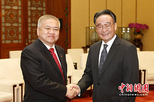 2010年4月8日,中国全国人大常委会委员长吴邦国在北京人民大会堂会见了马来西亚上议院议长王茀明。中新社发 盛佳鹏 摄
