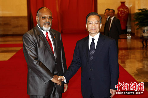 4月12日,中国国务院总理温家宝在北京人民大会堂与瓦努阿图总理纳塔佩举行会谈。中新社发 盛佳鹏 摄