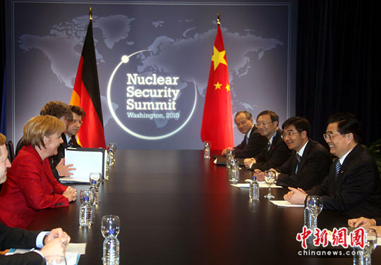 当地时间4月13日下午,正在华盛顿出席核安全峰会的中国国家主席胡锦涛会见了与会的德国总理默克尔。中新社发 张朔 摄
