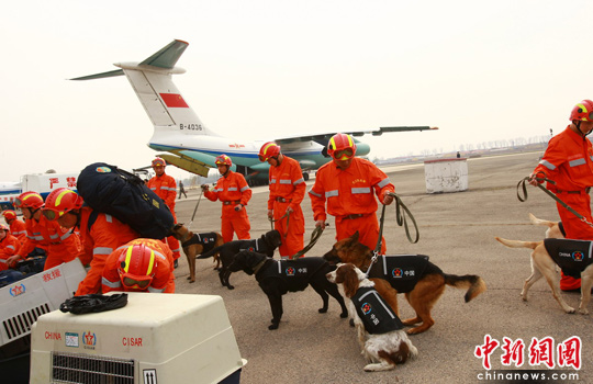 4月14日下午,中国国际地震救援队携带重型搜救设备搭乘空军专机赶赴青海玉树震区。中新社发 谭超 摄