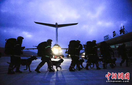 4月14日晚20点20分,从北京南苑机场出发的中国国际地震救援队抵达青海玉树机场。