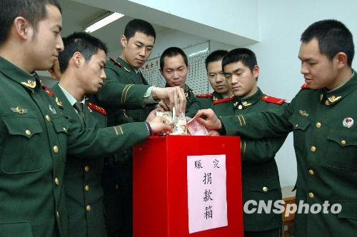 青海省玉树县发生7.1级地震后,驻守在浙江温州沿海一线的边防官兵迅速行动起来,积极向玉树地震灾区捐款捐物奉献爱心,支援灾区人民抗震救灾,度过难关。