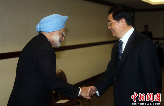 当地时间15日上午,中国国家主席胡锦涛在巴西首都巴西利亚下榻饭店会见前来出席“金砖四国”领导人会晤的印度总理辛格。胡锦涛今天戴一条蓝色领带,首先对辛格说明了自己因青海玉树灾情而提前回国的情况。辛格对此表示支持,并对中国人民表示慰问。