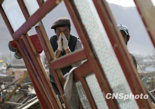 4月16日,青海玉树结古镇新建路的地震废墟里,人们在废墟中清理物品,并双手合十坦然面对记者镜头。中新社发 廖攀 摄