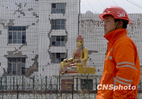 4月16日,救援队员在玉树民族师范学校废墟中的土弥桑布扎塑像前。中新社发 廖攀 摄