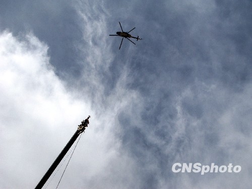 4月16日,数架直升机从青海玉树地震灾区上空低空飞过,开展震后灾情勘查。中新社发 孙自法 摄