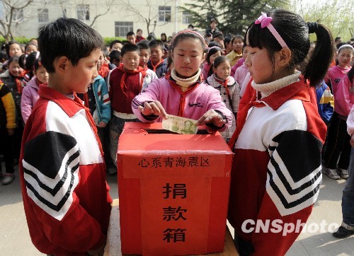 4月16日,山东省枣庄市凫城乡中心小学学生将自己的零花钱投进捐款箱。青海玉树县地震发生后,山东省枣庄市山亭区凫城乡中心小学200多名学生从电视、报刊中了解到地震给当地人民群众生命财产造成严重损失,他们自发向灾区捐款,奉献自己的一片爱心,帮助灾区人民早日渡过难关,重建家园。中新社发 李宗宪 摄