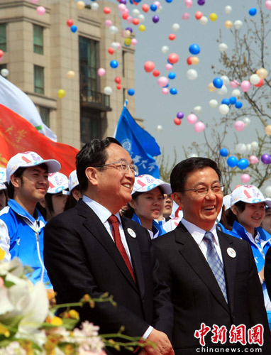4月17日,上海世博会志愿者宣誓上岗仪式在外滩举行,面对精神抖擞的志愿者代表,中共中央政治局委员、上海市委书记俞正声(左)、上海市长韩正在仪式上笑逐颜开。中新社发 潘索菲 摄