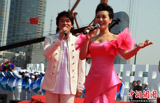 4月17日,上海世博会志愿者宣誓上岗仪式在外滩举行,著名歌手谭晶和周华健(左)共同深情演唱世博会志愿者主题歌《世界》。中新社发 潘索菲 摄