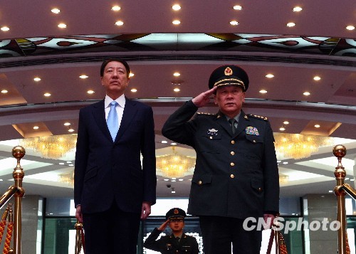 4月22日下午,中国国务委员兼国防部长梁光烈在北京八一大楼为来华访问的新加坡副总理兼国防部长张志贤访华举行欢迎仪式。中新社发 宋吉河 摄
