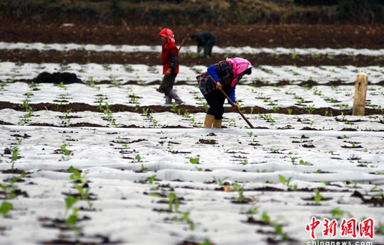 近日,云南旱区普降雨水,全省各地抓住有利时机开展大春播种。截至目前,云南省已投入拖拉机、抽水机等各类农机具100万台套,机耕机耙面积1200多万亩,比去年同期增20%,浇灌面积1300万亩,春播面积1208.9万亩。图为云南曲靖烟农正在移栽烟苗。中新社发 田洪 摄