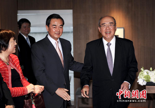 4月28日,中共中央台办、国务院台办主任王毅在上海举行酒会,欢迎中国国民党荣誉主席吴伯雄抵达上海出席世博会开幕活动。中新社发 廖攀 摄