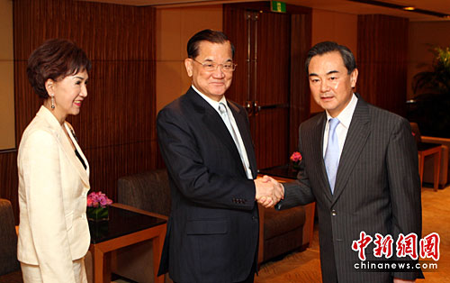 4月29日,中共中央台办、国务院台办主任王毅(右)在上海会见中国国民党荣誉主席连战及夫人一行,欢迎他们来上海参加世博会开幕活动。中新社发 汤彦俊 摄