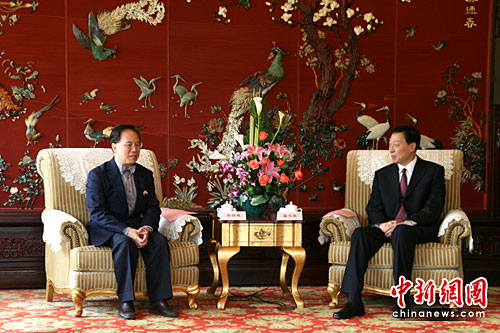 4月29日,江苏省长罗志军(右)在扬州迎宾馆会见前来扬州访问的香港特首曾荫权(左)。中新社发 崔佳明 摄