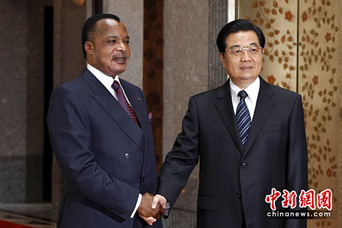 4月29日,中国国家主席胡锦涛在上海会见了刚果(布)总统萨苏。中新社发 盛佳鹏 摄