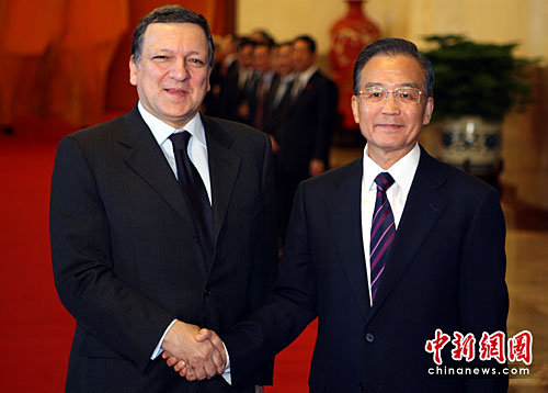 4月29日下午,中国国务院总理温家宝在北京人民大会堂欢迎欧盟委员会主席巴罗佐对中国进行正式访问。中新社发 任晨鸣 摄
