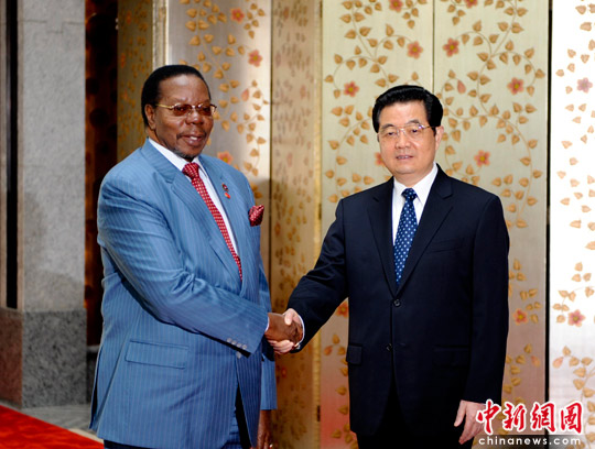 4月30日,中国国家主席胡锦涛在上海西郊宾馆会见前来出席上海世博会开幕式的马拉维总统穆塔里卡。中新社发 廖攀 摄