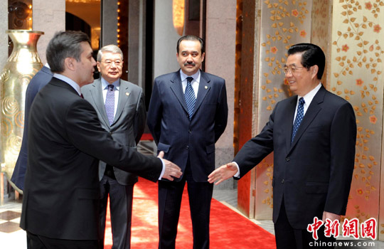 4月30日,中国国家主席胡锦涛在上海西郊宾馆会见前来出席上海世博会开幕式的哈萨克斯坦总理马西莫夫(右二)一行。中新社发 廖攀 摄