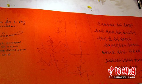 5月1日,上海世博会正式开园,中国国民党荣誉主席连战携夫人连方瑀一行来到中国馆参观。图为连战在结束中国馆参观后题写的“千年古都,开封领先”。中新社发 翁阳 摄