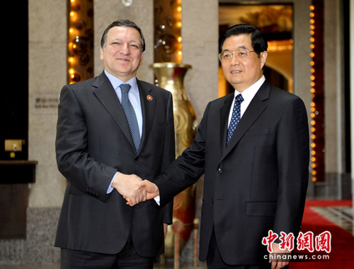 5月1日,中国国家主席胡锦涛在上海西郊宾馆会见欧盟委员会主席巴罗佐。中新社发 廖攀 摄