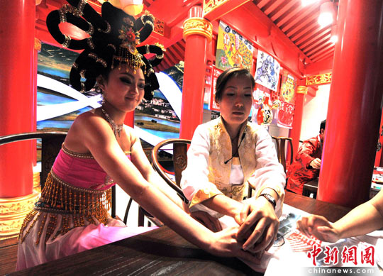 5月3日,上海世博会中国陕西馆的演员“杨贵妃”,在演出间隙为参观者的“世博会护照”盖纪念印章。中新社发 贾国荣 摄