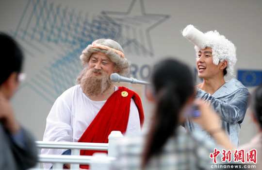 在上海世博园区,来自世界各地的游客走进世博园参观游览,园区里的奇特服饰扮靓世博园。中新社发 陈文 摄