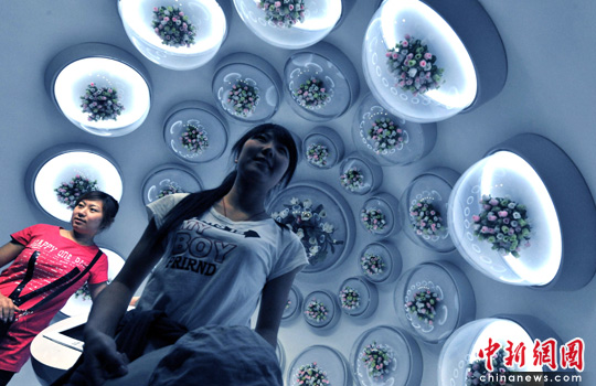 5月7日,上海世博园内的中国太空育种舱展示经过特殊培育手段绽放的花束,吸引不少年轻女孩。中新社发 贾国荣 摄