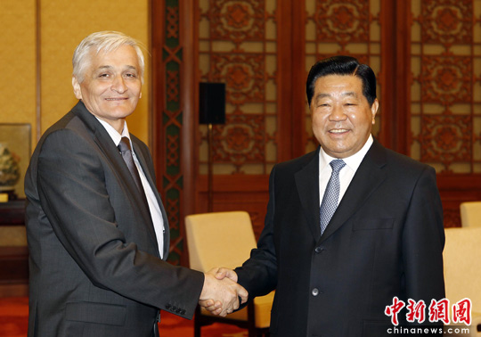 5月7日,中国全国政协主席贾庆林在北京人民大会堂会见波黑部长会议主席尼古拉·什皮里奇。中新社发 盛佳鹏 摄