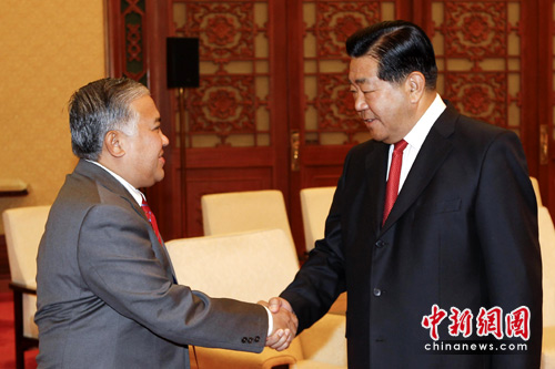 5月12日,中共中央政治局常委、全国政协主席贾庆林在北京人民大会堂会见了来京出席亚洲宗教和平会议(简称“亚宗和”)2010年度执委会议的“亚宗和”执行主席山苏汀(左)、秘书长金星坤等“亚宗和”高层人士。中新社发 盛佳鹏 摄
