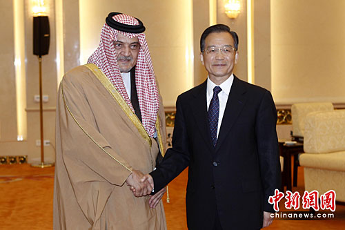 2010年5月12日,中国国务院总理温家宝在北京人民大会堂会见了沙特阿拉伯外交大臣费萨尔。中新社发 盛佳鹏 摄