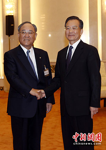 2010年5月12日,中国国务院总理温家宝在北京人民大会堂会见了御手洗富士夫和米仓弘昌率领的日本经济团体联合会代表团。中新社发 盛佳鹏 摄