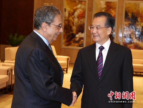 5月13日下午,中国国务院总理温家宝在天津市滨海新区会见前来参加“中阿合作论坛第四届部长级会议”的阿盟秘书长穆萨。中新社发 任晨鸣 摄