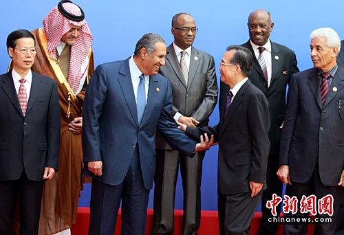 5月13日下午,中国国务院总理温家宝在天津市滨海新区会见参加“中阿合作论坛第四届部长级会议”的各国宾客,中共中央政治局委员、中共天津市委书记张高丽(左一)等陪同会见。中新社发 任晨鸣 摄