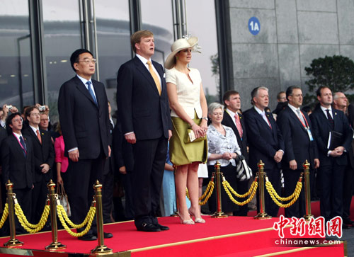 5月18日,荷兰王储威廉·亚历山大王子携马克西玛王妃在上海出席世博荷兰国家馆日。中国水利部部长陈雷陪同。中新社发 杜洋 摄