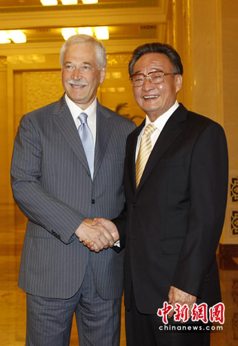 5月18日,中国全国人大常委会委员长吴邦国在北京人民大会堂与俄罗斯国家杜马主席格雷兹洛夫举行会谈。中新社发 盛佳鹏 摄
