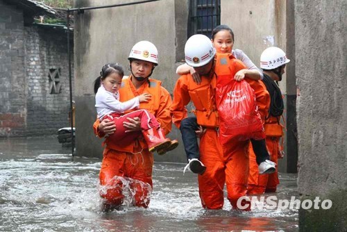 5月21日上午,江西萍乡市区低洼地段由于强降雨出现积水,消防战士成功解救25名被困群众,其中10名小孩、4名老人,并协助当地近百名居民成功撤离。中新社发 丁宏 摄