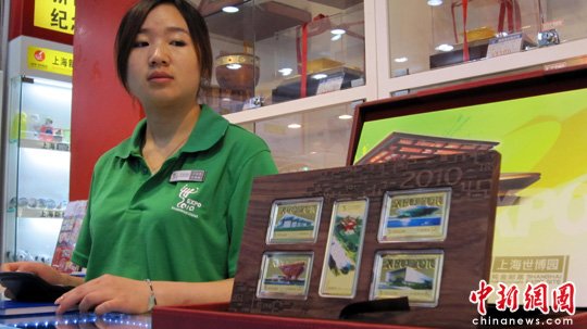 5月23日,经上海世博会事务协调局授权、中国邮政集团公司批准,上海市集邮总公司制作发行的“上海世博园纯金(仿印)邮票”正式对外发售。该套邮票以上海世博园永久性标志建筑“1轴4馆”为题材,用50克99.9%黄金制成纯金邮票共5枚,全球限量发行10000套,首发价为19980元人民币,今后售价将随国际金价走势调整。中新社发 姜煜 摄