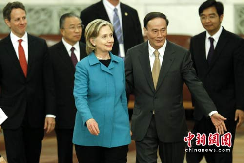 5月25日,第二轮中美战略与经济对话在北京结束。美国总统奥巴马的特别代表、国务卿希拉里·克林顿、财政部长盖特纳同中国国家主席胡锦涛的特别代表、国务院副总理王岐山和国务委员戴秉国出席了总结对话成果的联合记者会。 中新社发 盛佳鹏 摄