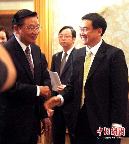 5月25日,台湾海基会董事长江丙坤(左)在台北会见了正率团来台访问的河北省副省长杨崇勇(右),他在会见致辞时表示,大陆访问团频繁访台,不仅促进两岸经贸合作,也创造两岸和平发展基础。中新社发 罗钦文 摄