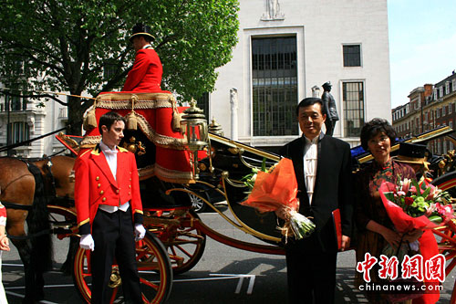 当地时间5月26日,抵英近三个月的中国驻英大使刘晓明,26日乘坐英国王室派出的马车,在王室使团副典礼长西蒙·马丁陪同下,前往白金汉宫向英国女王伊丽莎白二世递交国书。他在随后于中国驻英使馆举行的招待会上称,女王陛下非常关心中英两国关系,祝刘大使在英工作顺利。图为刘晓明在递交国书后,在中国驻英使馆前与夫人合影。中新社发 魏群 摄