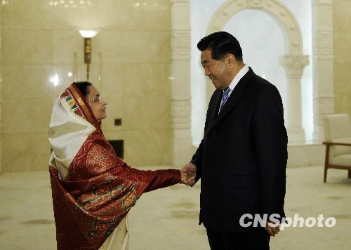 5月28日,中国全国政协主席贾庆林在北京人民大会堂会见了印度总统帕蒂尔。中新社发 廖攀 摄