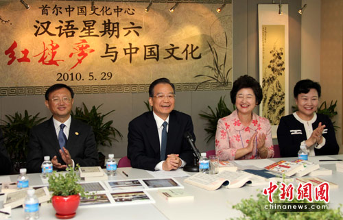 5月29日,正在韩国访问的中国总理温家宝视察首尔中国文化中心,并与韩国的汉语学习者一起讨论《红楼梦》与中国文化。中新社发 周兆军 摄