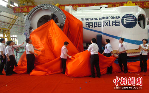 由广东明阳风电产业集团承担的中国国家重点产业振兴与改造项目——2.5/3.0MW超紧凑型(SCD)风电机组、目前中国最大的海上风力发电风机,5月29日在广东中山下线,这标志着中国海上风电整机装备制造水平在世界风力发电领域占领了新的制高点。 中新社发 罗仰明 摄