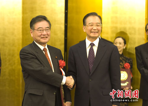 5月30日晚,温家宝总理在他下榻的东京新大谷饭店会见日本民间友好团体和友好人士代表并颁奖。图为温总理与中国人民的老朋友,日中友好协会会长加藤紘一(左)紧紧握手。中新社发 孙冉 摄