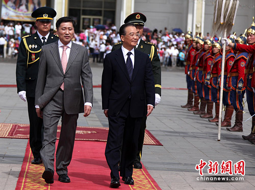 6月1日,中国总理温家宝抵达蒙古国进行正式访问。图为温家宝出席蒙古国总理巴特包勒德为他举行的欢迎仪式。中新社发 周兆军 摄