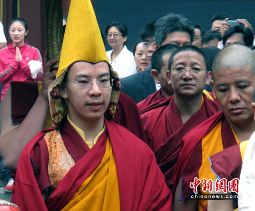 6月2日是青海玉树“4·14”强烈地震发生的第49天,中国各地佛教协会、众多寺院为地震灾区举行了隆重的“七七”超荐祈福法会。图为中国佛教协会副会长第十一世班禅额尔德尼·确吉杰布在北京雍和宫主持藏传佛教超度法会。中新社发 刘舒凌 摄