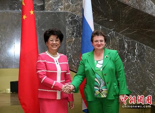 当地时间6月4日,第六届中俄妇女文化周暨第四届中俄妇女论坛在莫斯科举行开幕式。中国全国人大常委会副委员长、全国妇联主席陈至立率中国妇女代表团出席。图为陈至立与俄联邦委员会副主席奥尔洛娃亲切握手。中新社发 田冰 摄