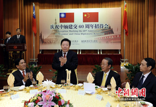 6月8日晚,中国人民对外友好协会与缅甸联邦驻华大使馆在北京联合举办中缅建交60周年庆祝招待会。全国政协副主席孙家正(中)和缅甸外长吴年温出席了招待会。中新社发 刘震 摄
